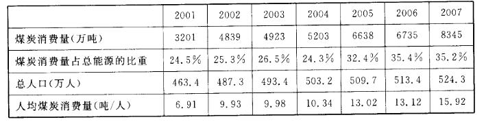 下表是某国2001年至2007年煤炭消费量变化及相关数据,请问下面描述正确的是()
