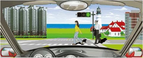 驶近一个设有信号灯路口,遇到图中所示的信号灯亮着,但有行人通过,怎么做是正确的?