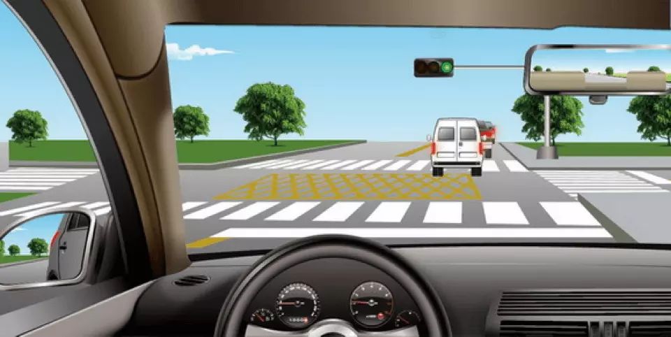 如图所示,驾驶机动车直行遇前方道路堵塞时,车辆可以在黄色网格线区域临时停车等待,但不得在人行横道停车。
