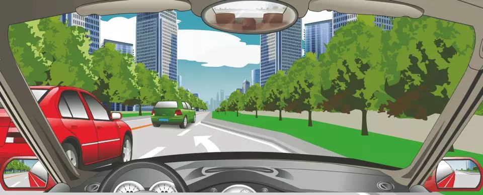 遇到这种情况时,要加速从红车前变更车道。