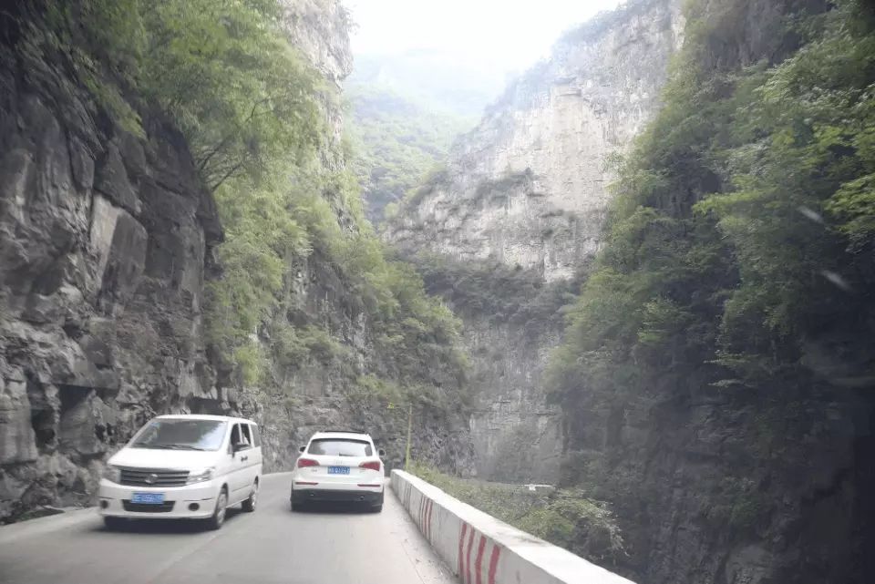 如图所示,驾驶机动车在这样的路段遇前方两车交会应及时减速。