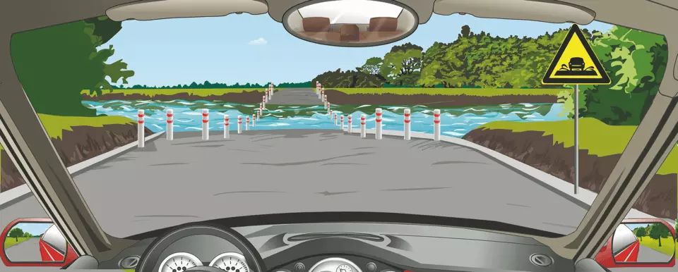 右侧标志提醒前方是过水路面。
