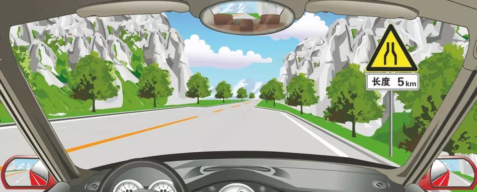 右侧标志警告前方路面两侧变窄长度为5公里。
