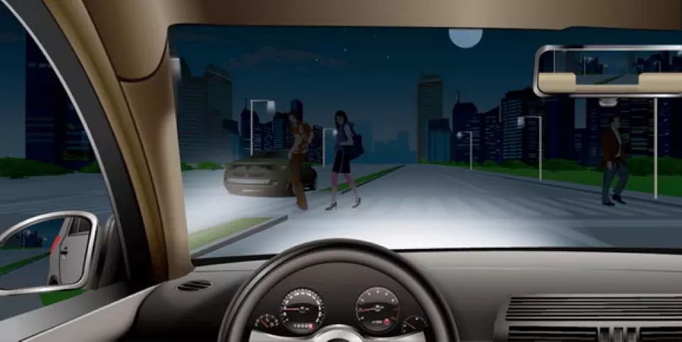 如图所示,夜间驾驶机动车通过没有交通信号灯的人行横道时,以下做法正确的是什么?