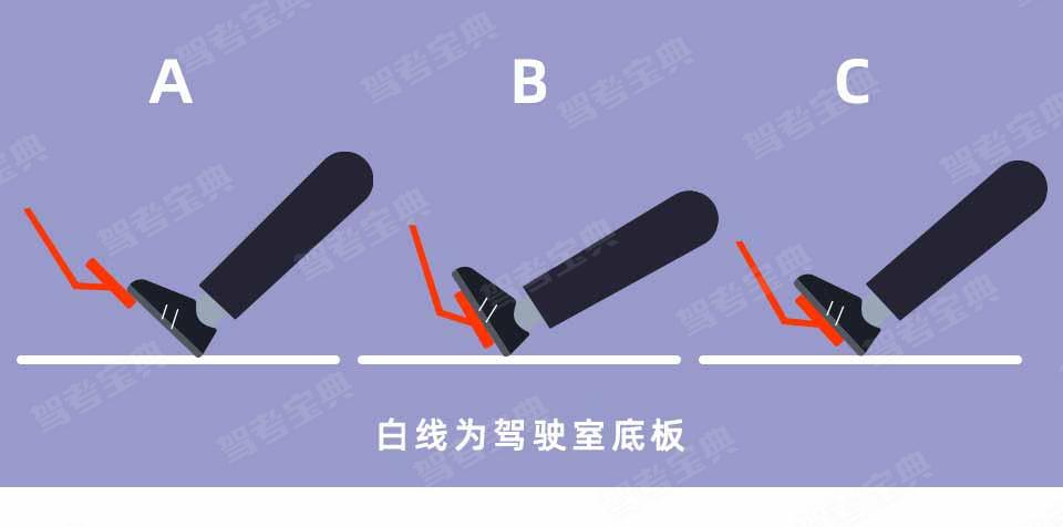 如图所示,踩踏加速踏板的规范操作动作是___。(白线为驾驶室底板)